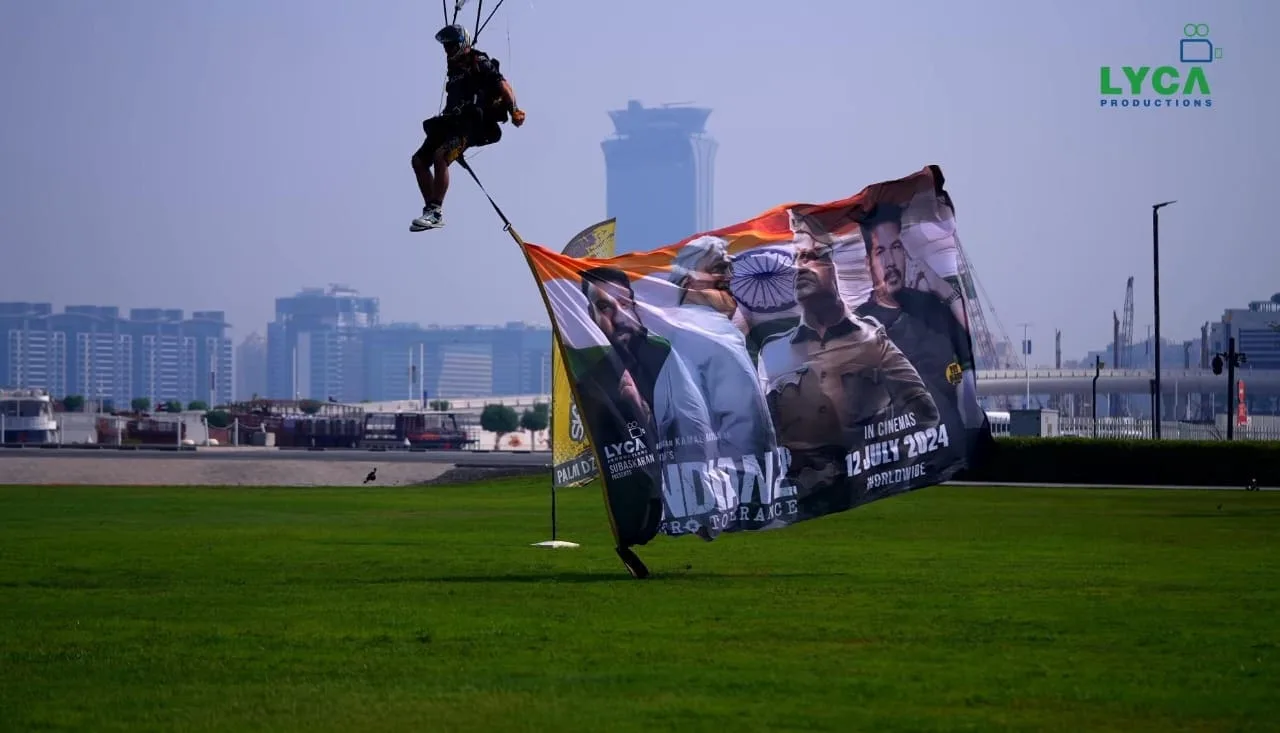 The “Indian 2” flag soared high in the skies of Dubai as a skydiver elevated the film’s promotion to new heights. The “Indian 2” team is leaving no stone unturned in their efforts to generate excitement for the pan-Indian drama, ensuring widespread promotion across various locations.