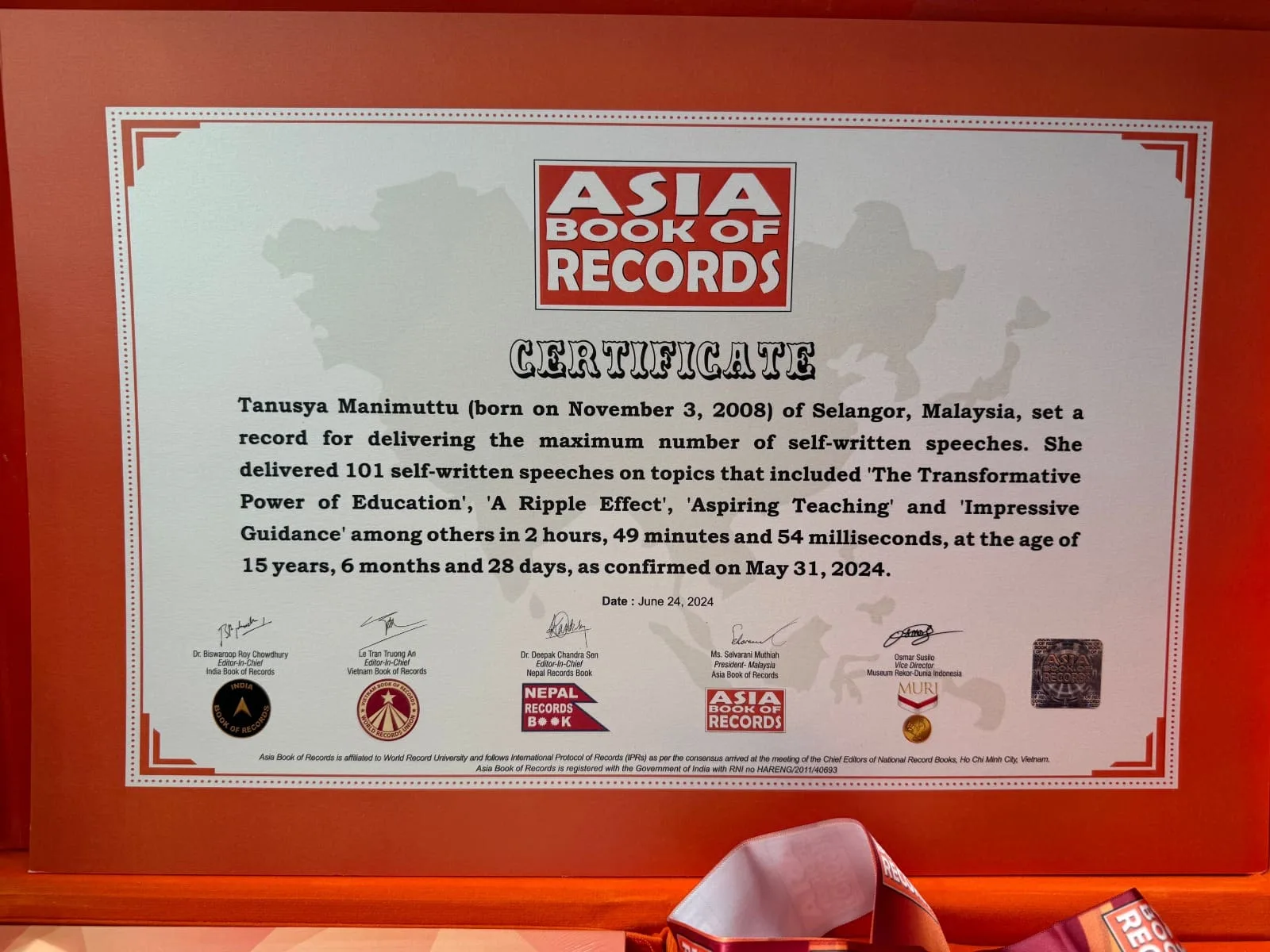 “Witnessing Tanusya achieve the Asia Book of Records at just 15 by delivering the maximum number of self-written speeches consecutively has been an incredibly proud and emotional experience for me as her mother. Seeing her dedication, hard work, and passion come together in this remarkable accomplishment fills me with immense pride. It’s truly awe-inspiring to watch her set such high standards and achieve her goals with unwavering determination. As her mother, I couldn’t be prouder of her. She’s setting a wonderful example for others at such a young age. A heartfelt thank you to SMK Damansara Utama’s Pengetua and teachers for their great support in this initiative,” said Tanusya’s mother.
