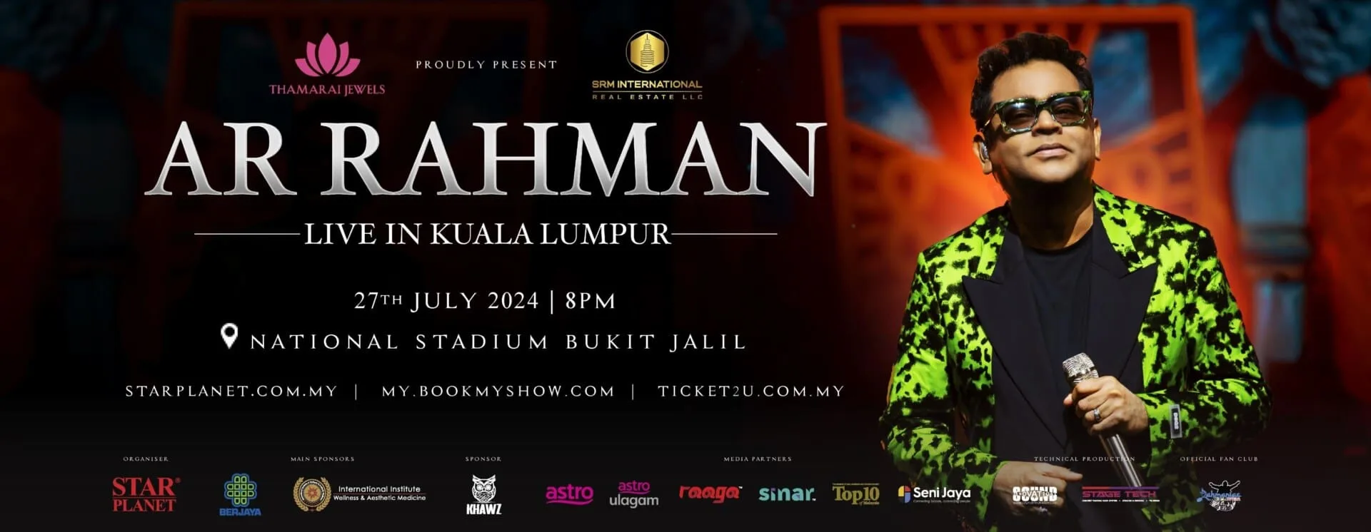 Jointly presented by Thamarai Jewels and SRM International Real Estate LLC and organized by Star Planet, the A.R. Rahman Live in Kuala Lumpur 2024 concert will feature Rahman’s iconic hits and cherished songs, enhanced by extraordinary visual and audio production. Joining A.R. Rahman on stage in July will be an exceptional lineup of singers, including Mano, Srinivas, Sri Rascol, Shweta Mohan, Shakthisree Gopalan, Blaaze, ADK, Ameen Rahman, Shubha Vedula, Shivang Sudhir Vaishnav, Hriday Deepak Gattani, and Bhavin Navin Pushkama.