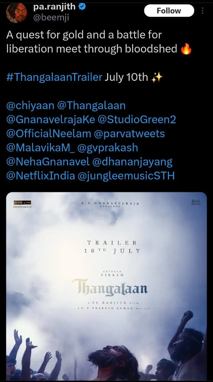 On Monday, the team behind Vikram’s film “Thangalaan” announced that the trailer would be released today, July 10. They have just posted that the trailer will premiere at 5pm IST, which is 7.30pm Malaysian time. Directed by Pa Ranjith, the film is currently in the post-production phase, and the official release date has not been announced yet. However, there is speculation that the movie may be set to premiere on August 15, coinciding with Independence Day of India.