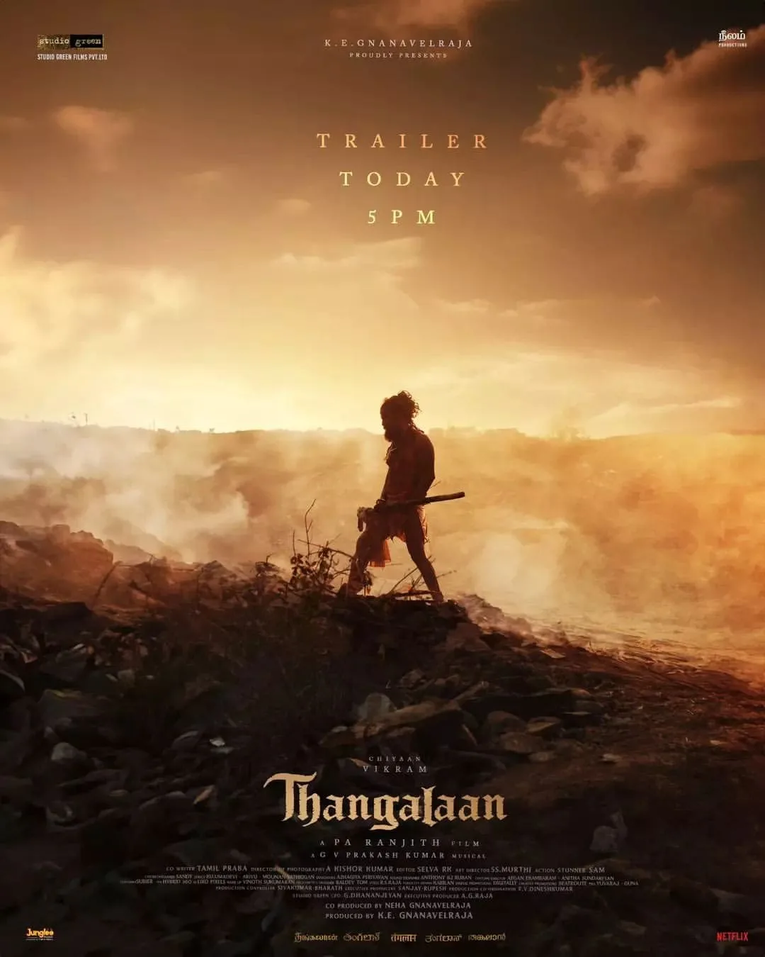 “Thangalaan” is being produced by Studio Green and Neelam Productions. The film’s soundtrack is composed by GV Prakash, marking his first partnership with the director. Tamil Prabha serves as the co-writer, with Selva RK overseeing editing and SS Murthi in charge of the art department.