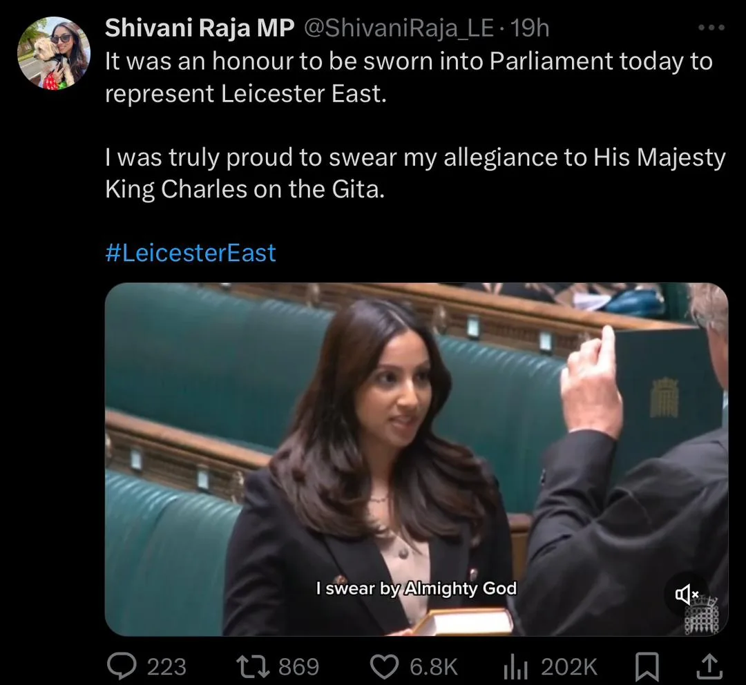 Soon after being sworn in as a British MP, Shivani expressed on X platform: “It was a privilege to take my oath in Parliament today and serve as the representative for Leicester East. I am deeply proud to pledge my allegiance to His Majesty King Charles on the Gita.”