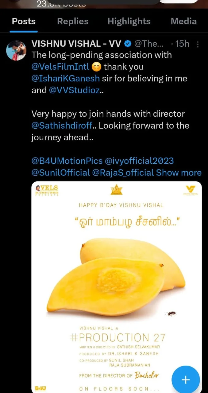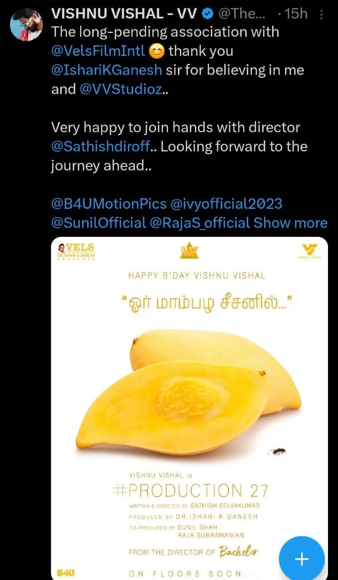 Vishnu Vishal expressed his excitement to join hands with director Sathish and thanked him for believing in him. Vishnu Vishal is gearing up for a busy schedule ahead with multiple films at different stages of production. Among his upcoming projects is “Mohandas,” directed by Murali Karthick of “Kalavu” fame, and “Aaryan,” helmed by debutant director Praveen K, which is eagerly anticipated for release. Additionally, Vishnu Vishal has confirmed collaborations with directors Ramkumar and Chella Ayyavu, both of whom he has previously worked with on the successful thriller “Ratsasan.”