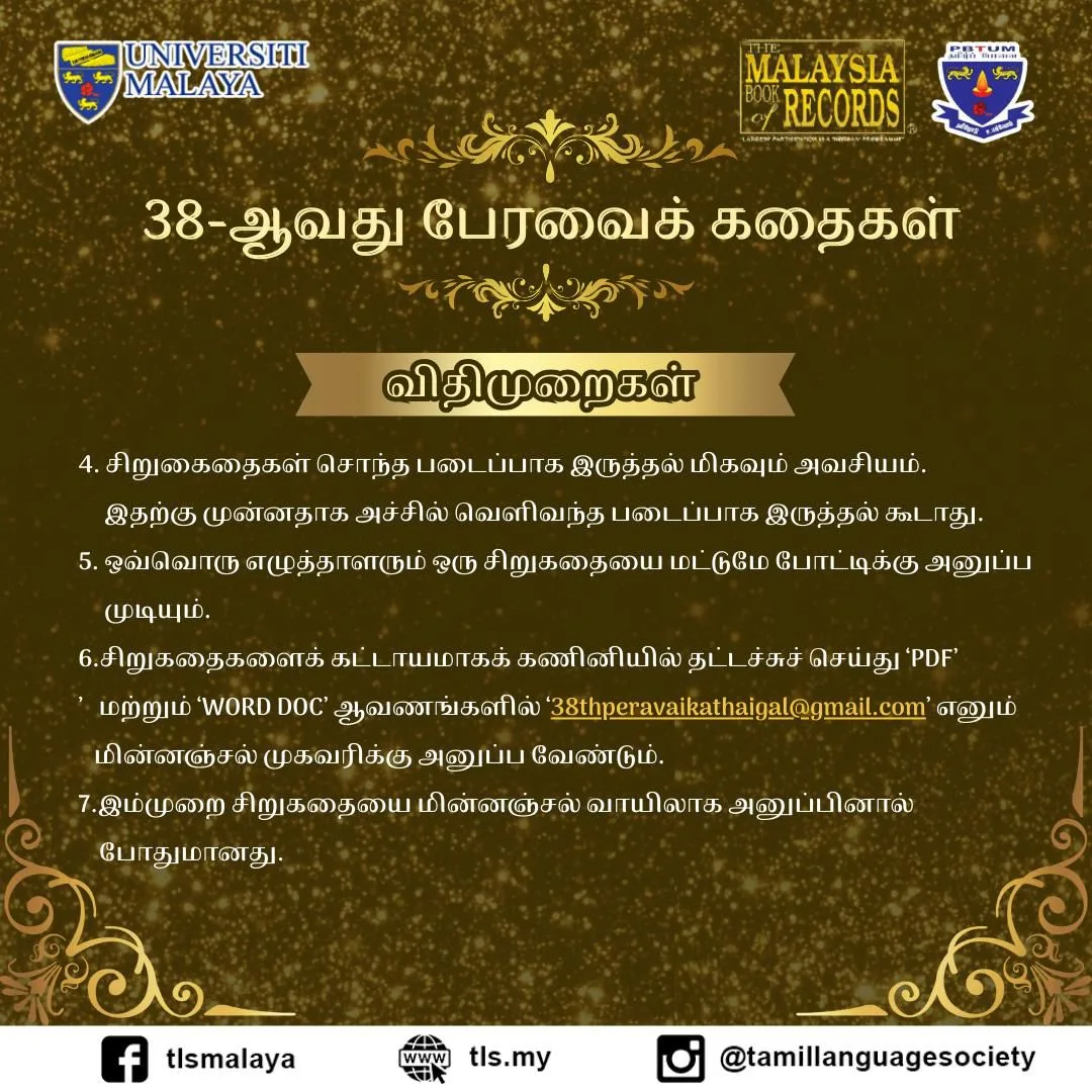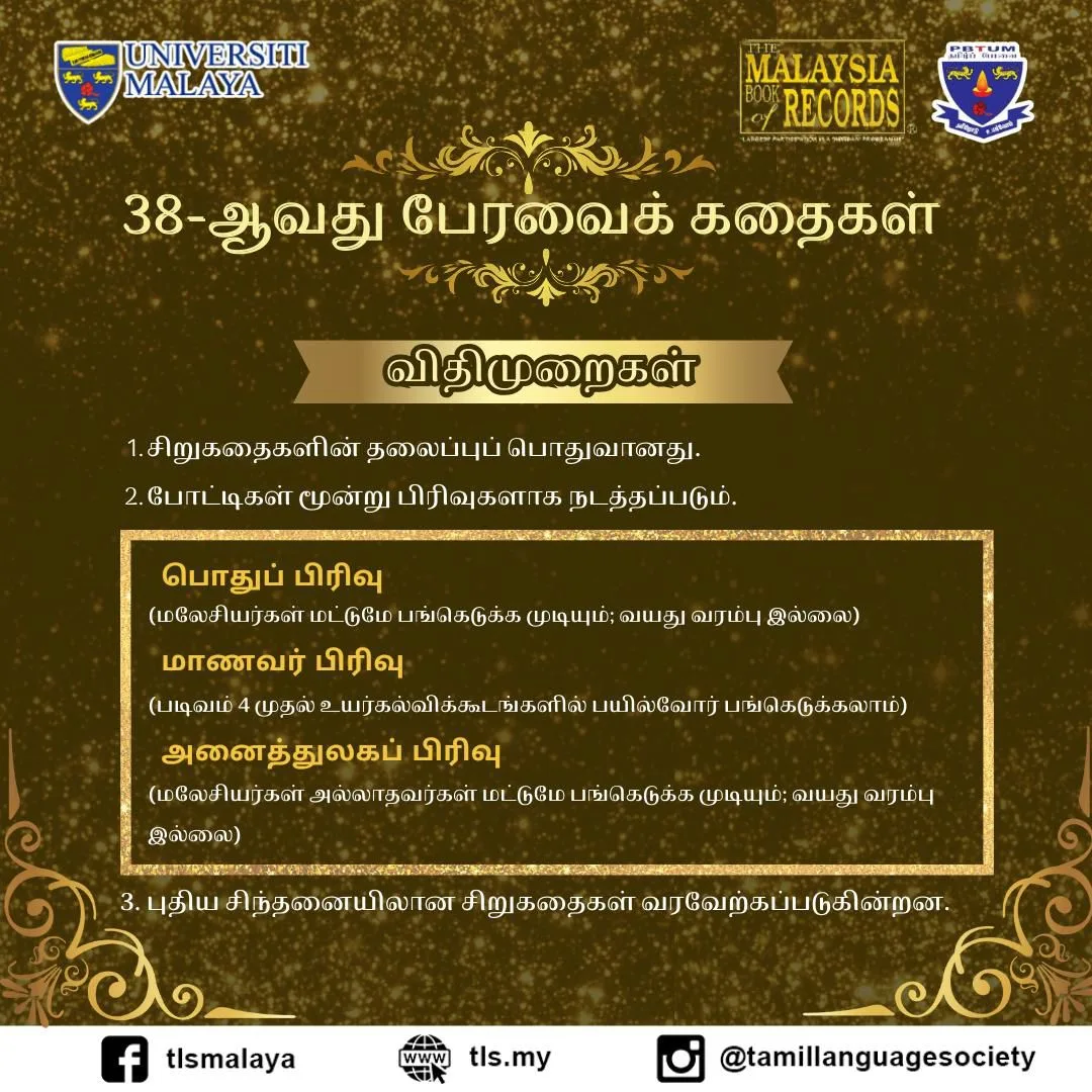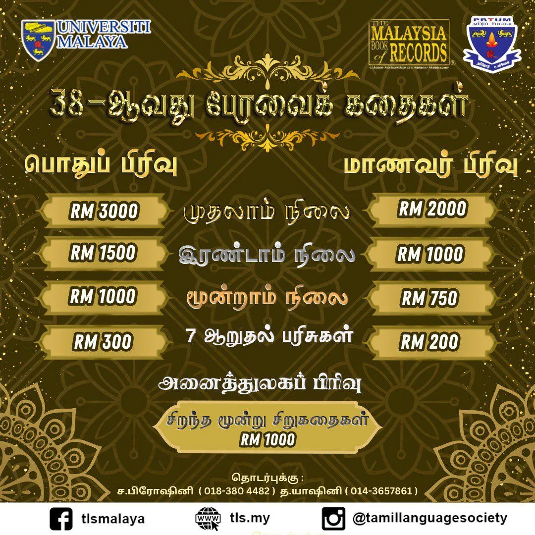 The renowned Tamil Language Society of University Malaysia is currently organizing its 38th ‘Peravai Kathaigal’ competition, which runs until July 26th. This prestigious short story competition welcomes Tamil enthusiasts worldwide to participate, aiming to foster literary talent and celebrate the richness of Tamil literature.