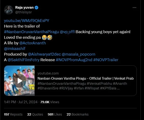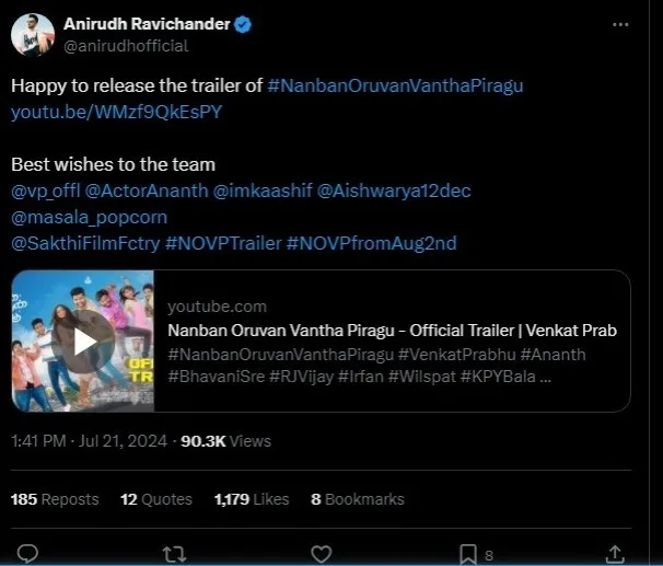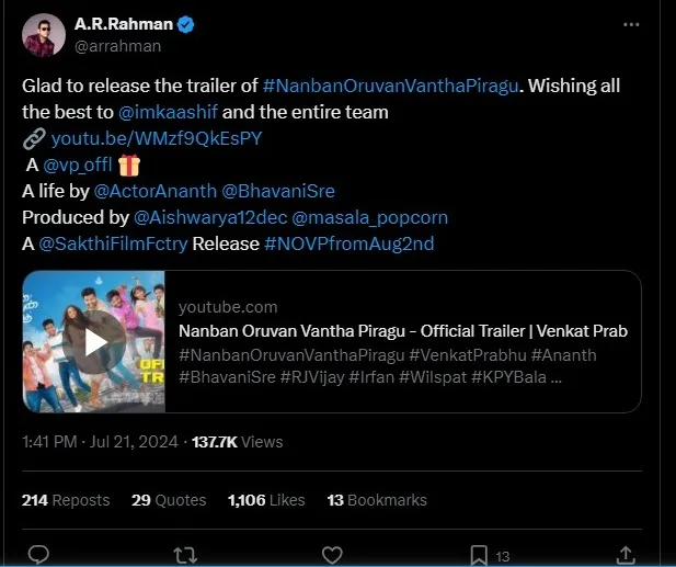 The creators of “Nanban Oruvan Vantha Piragu” have released the trailer, hinting at an engaging narrative centered on friendship. The trailer was launched on social media by renowned music composers AR Rahman, Anirudh, and Yuvan Shankar Raja, garnering significant attention and creating a buzz among fans. The involvement of these prominent figures in the trailer’s release has given the film a grand introduction, raising expectations and excitement for its upcoming release.