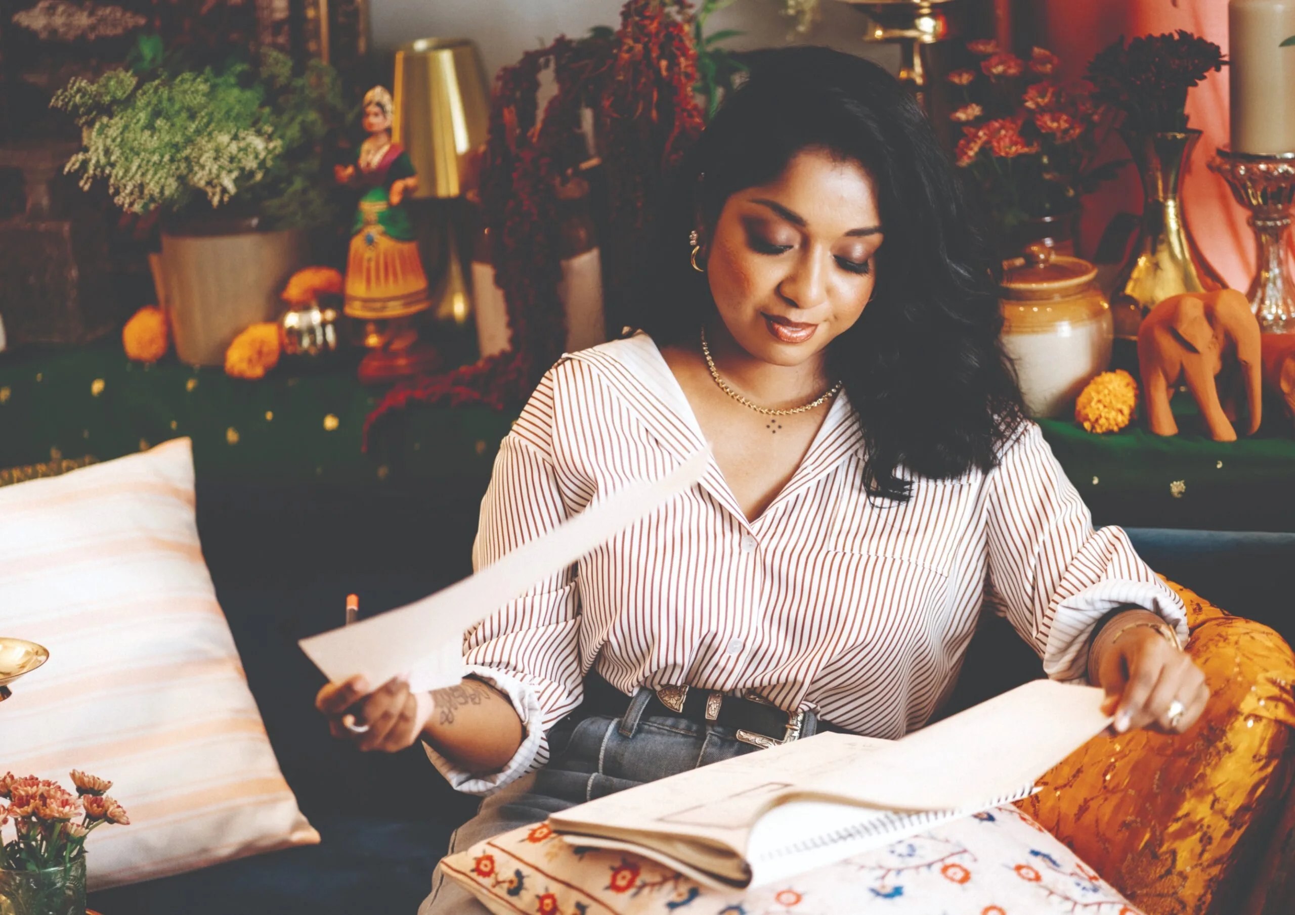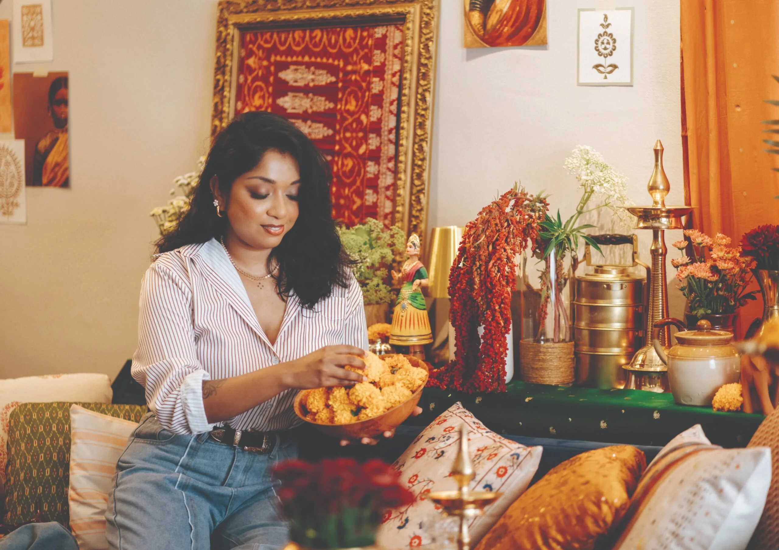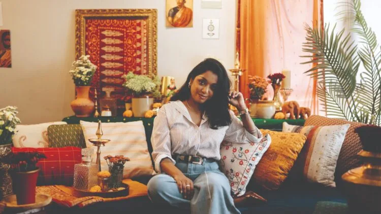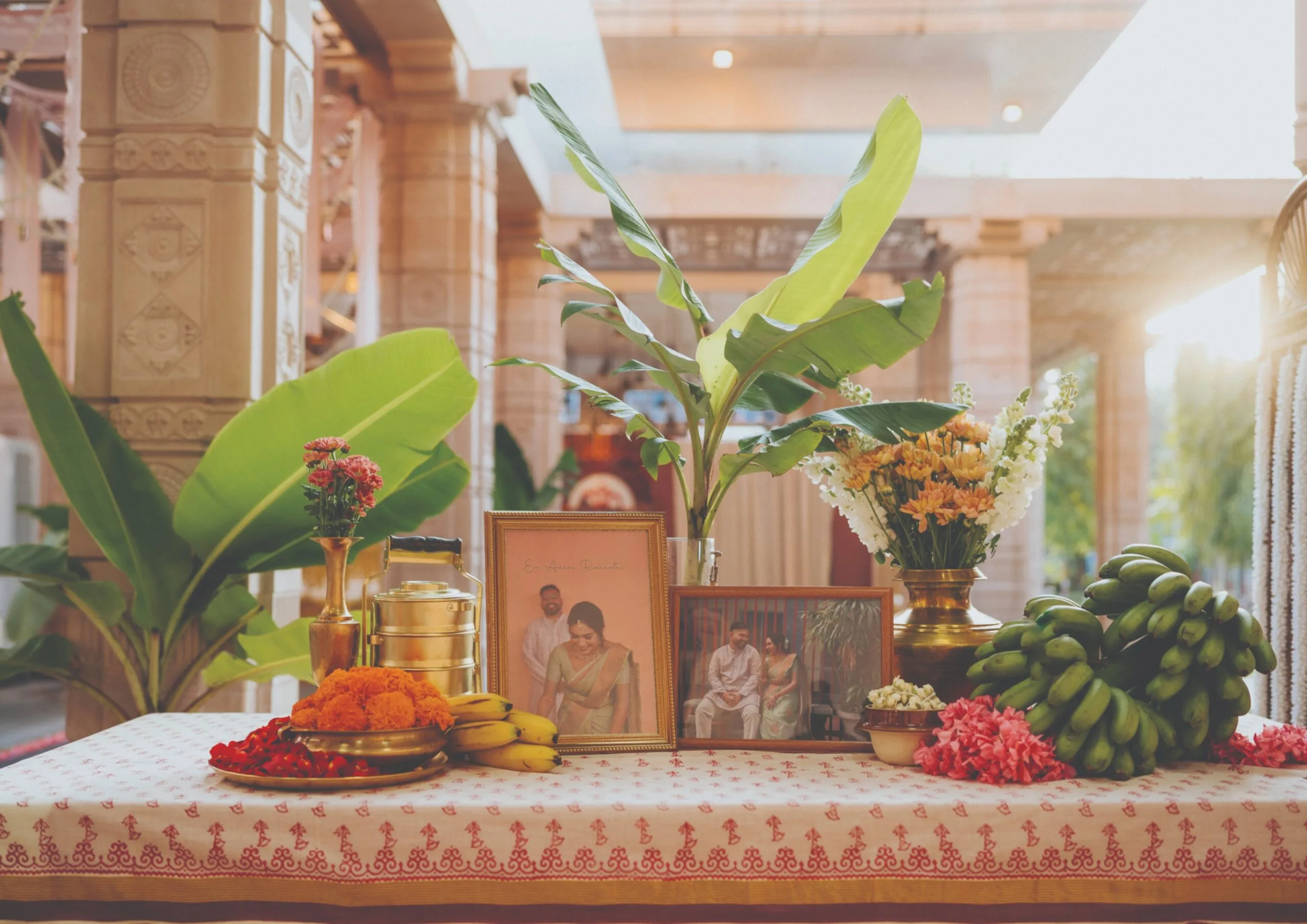 One notable project involved styling both a wedding and reception for a close friend, where Nandini had complete creative freedom. She developed a niche for blending traditional South Indian elements with contemporary fashion, using items like banana leaves, antique brass-wear, and ancient Sanskrit block prints in modern arrangements.
