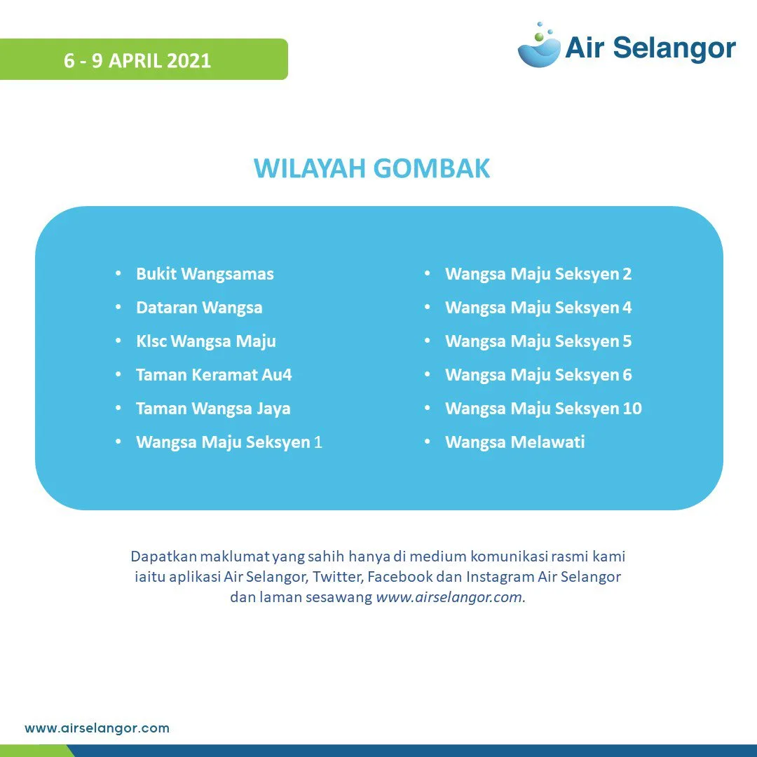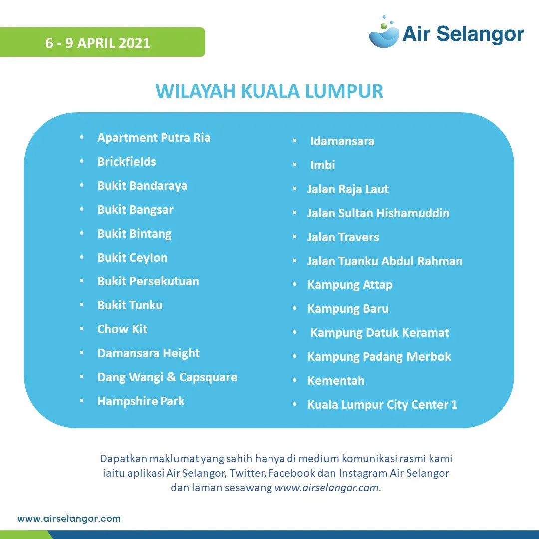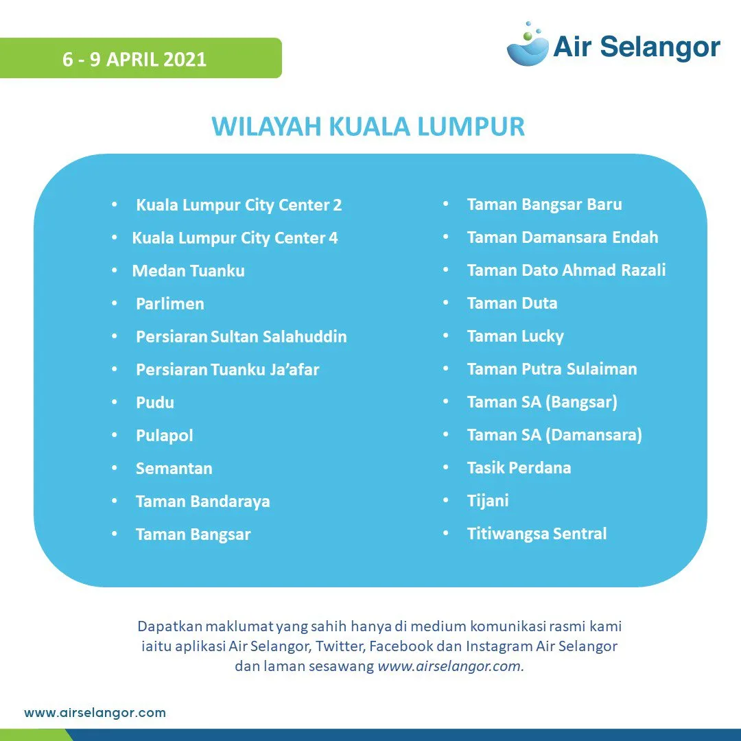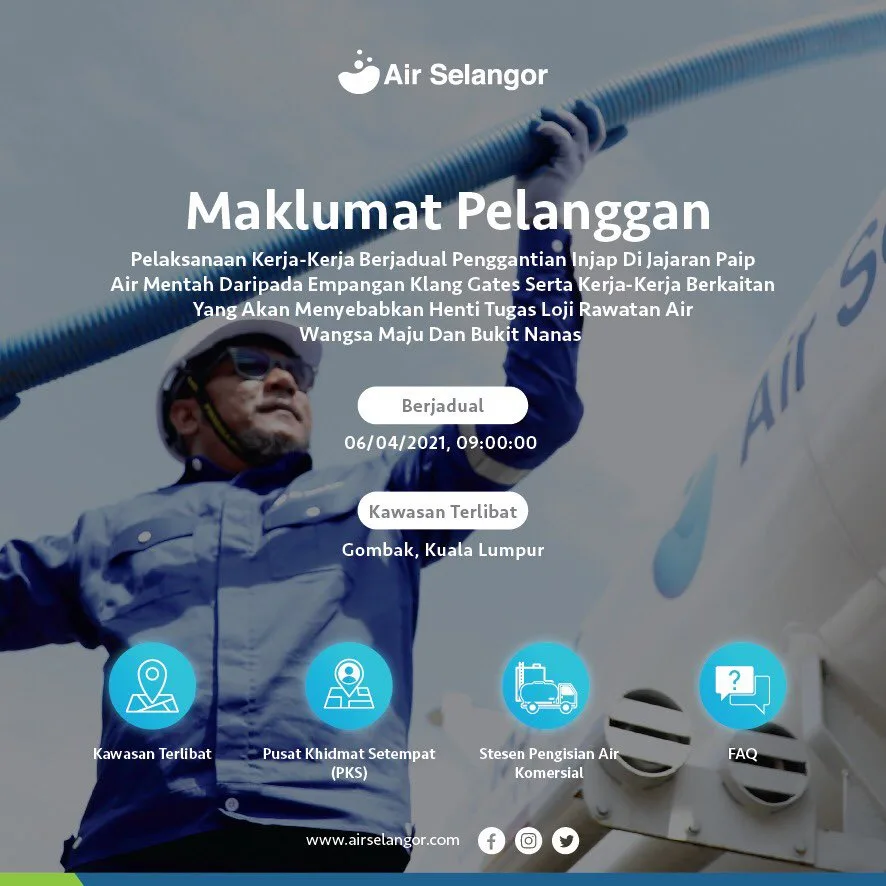 Please visit hentitugas.airselangor.com. to check out the latest updates on water disruption in your area.