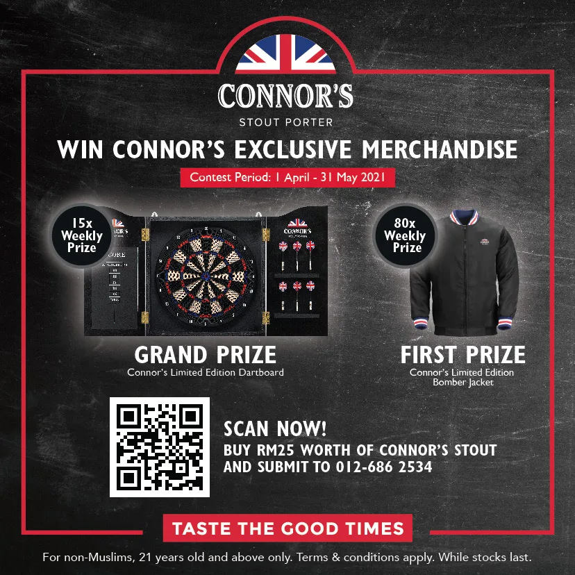 More to Come! Consumers who purchase RM25 and above of Connor’s in cans between 1 April to 31 May online or in-store will also stand to win 15 weekly grand prizes of a limited-edition Connor’s Dartboard and 80 weekly prizes of Connor’s limited-edition bomber jacket through its national consumer promo contest.