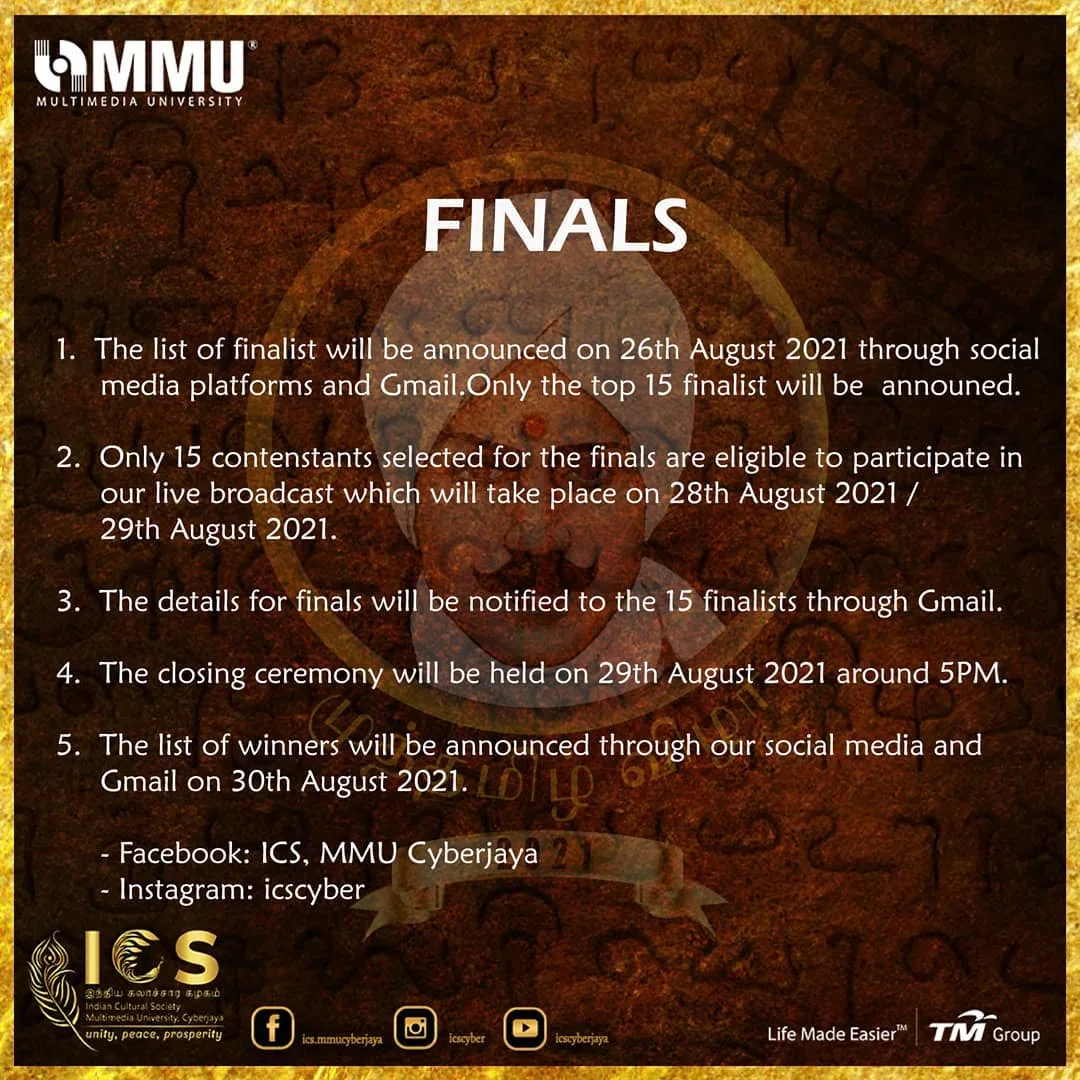 Spearheaded by the Indian Cultural Society (ICS) of Multimedia University (MMU) Cyberjaya will be organising one of its major events of the year, Muthamizh Vizha 2021. All Malaysian Tamil students who have the passion for our mother tongue are encouraged to take part in the competition.