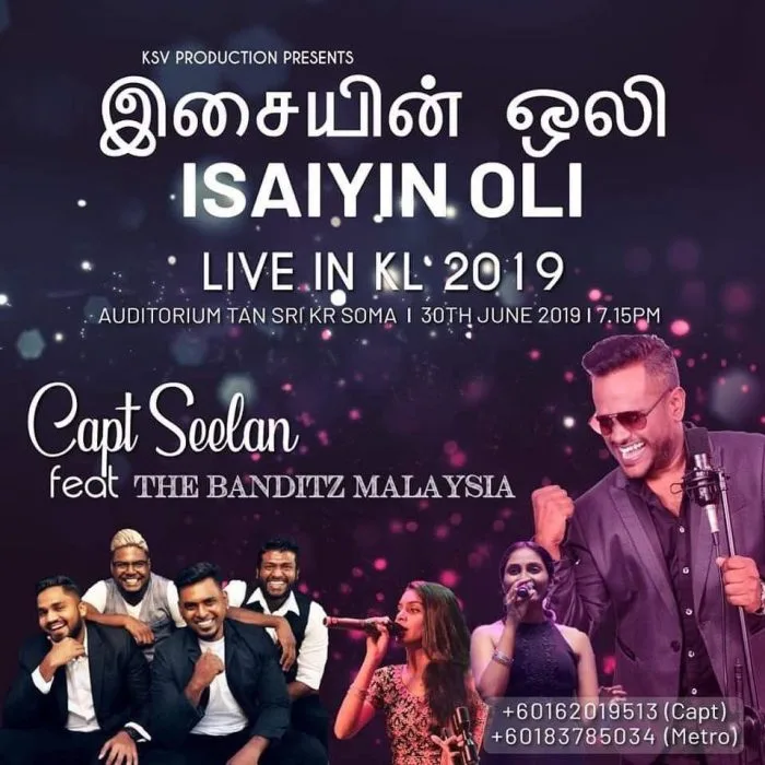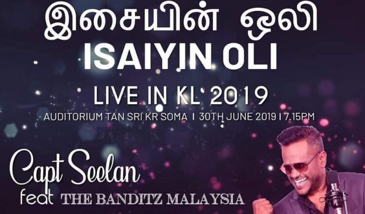 Isaiyin Oli will take place on the 30th of June 2019 at Auditorium Tan Sri KR Soma. To get your tickets, contact Captain Seelan at +6016 201 9513, or Jeff at +6018 378 5034.