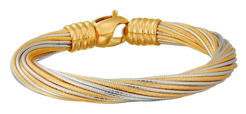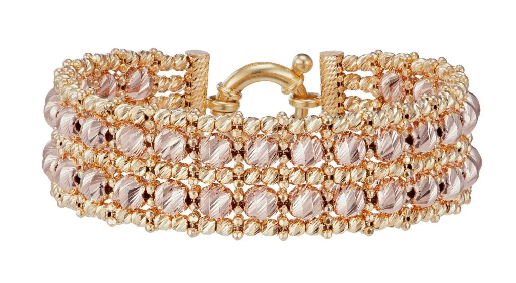 The interchangeable bracelets come in multicoloured gold to give you two distinct looks