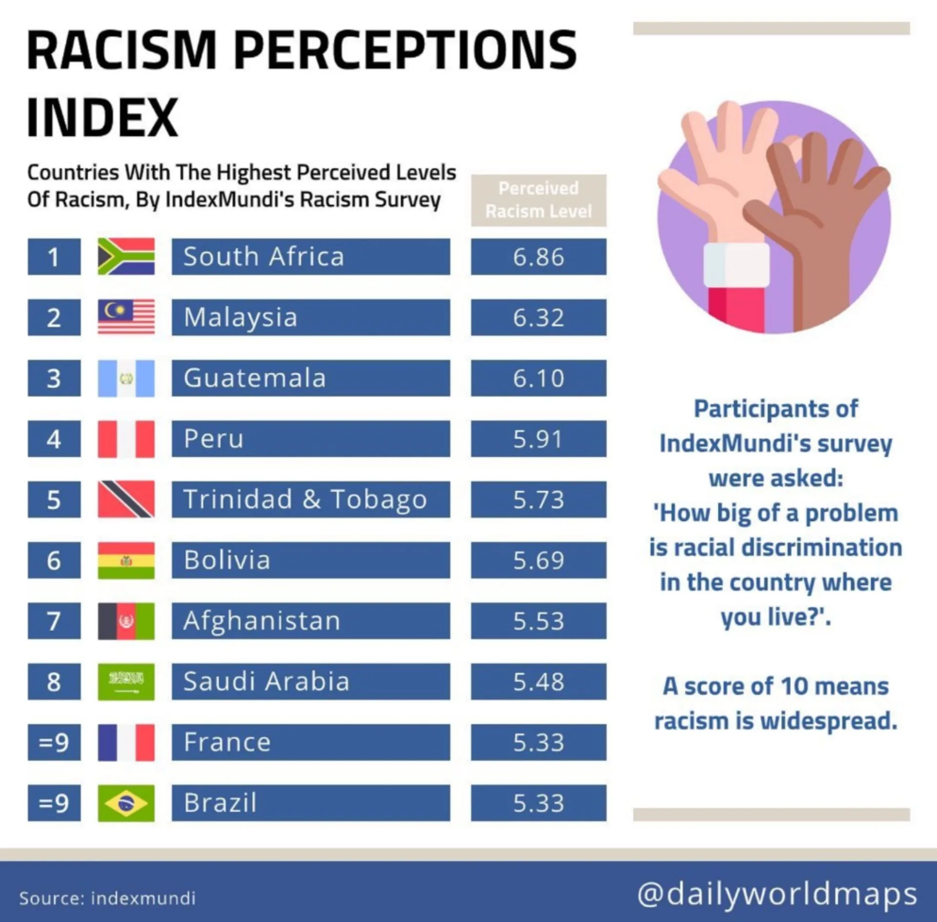 Indexmundi, the Racial Discrimination Survey has ranked Malaysia as the second most racist country among the rest of 76 countries in the world.