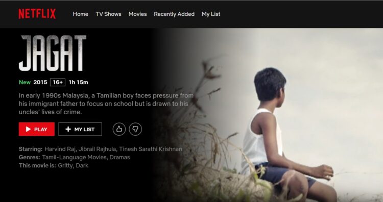 The award winning film Jagat is first Malaysian Tamil film on Netflix. The crime drama directed by Shanjhey Kumar Perumal was released in 2015.