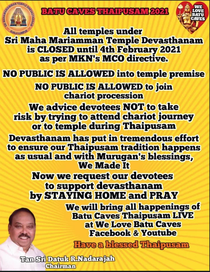 Devotees are not permitted to participate and with no stops anywhere throughout the ceremonial procession. The ministry has also mentioned that they would monitor the chariot journey to ensure complete conformity with the standard operating procedures (SOPs) that have been stipulated under the Prevention and Control of Infectious Diseases Act 1988 (Act 342).