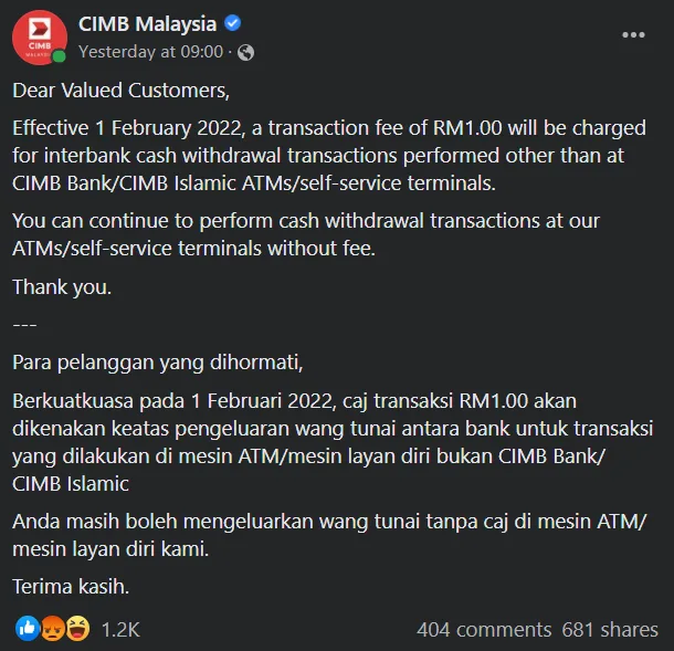 According to announcements made on the banks’ social media accounts, the reimposition of the RM1 Malaysian Electronic Payment System interbank ATM withdrawal fee will be starting 1st February 2022 (TODAY).