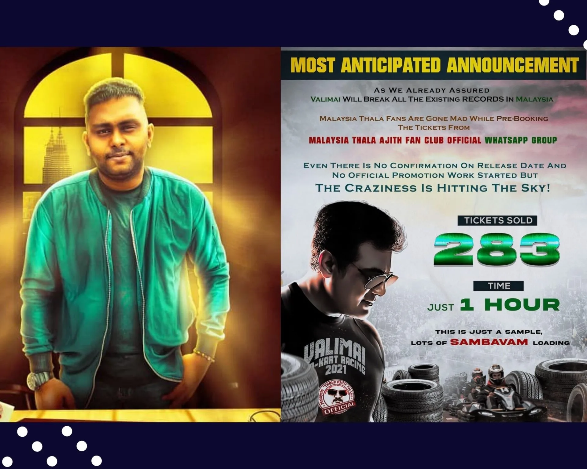 Terrific pre-booking for #Valimai, 283 tickets in just an hour! Yes, you read that right! Malaysia Thala Ajith Fan Club ...